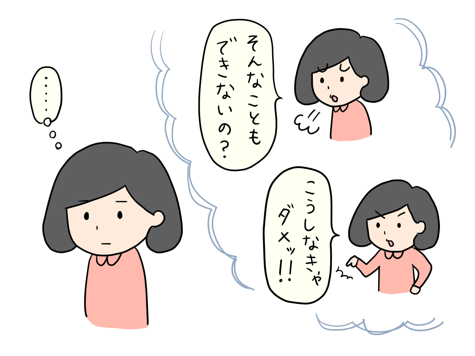 その基準には、「自分はこうあるべき」、「できて当たり前」という理想像があり、その理想像に届かない自分を強く否定する気持ちが、自分を責める事に繋がっています。