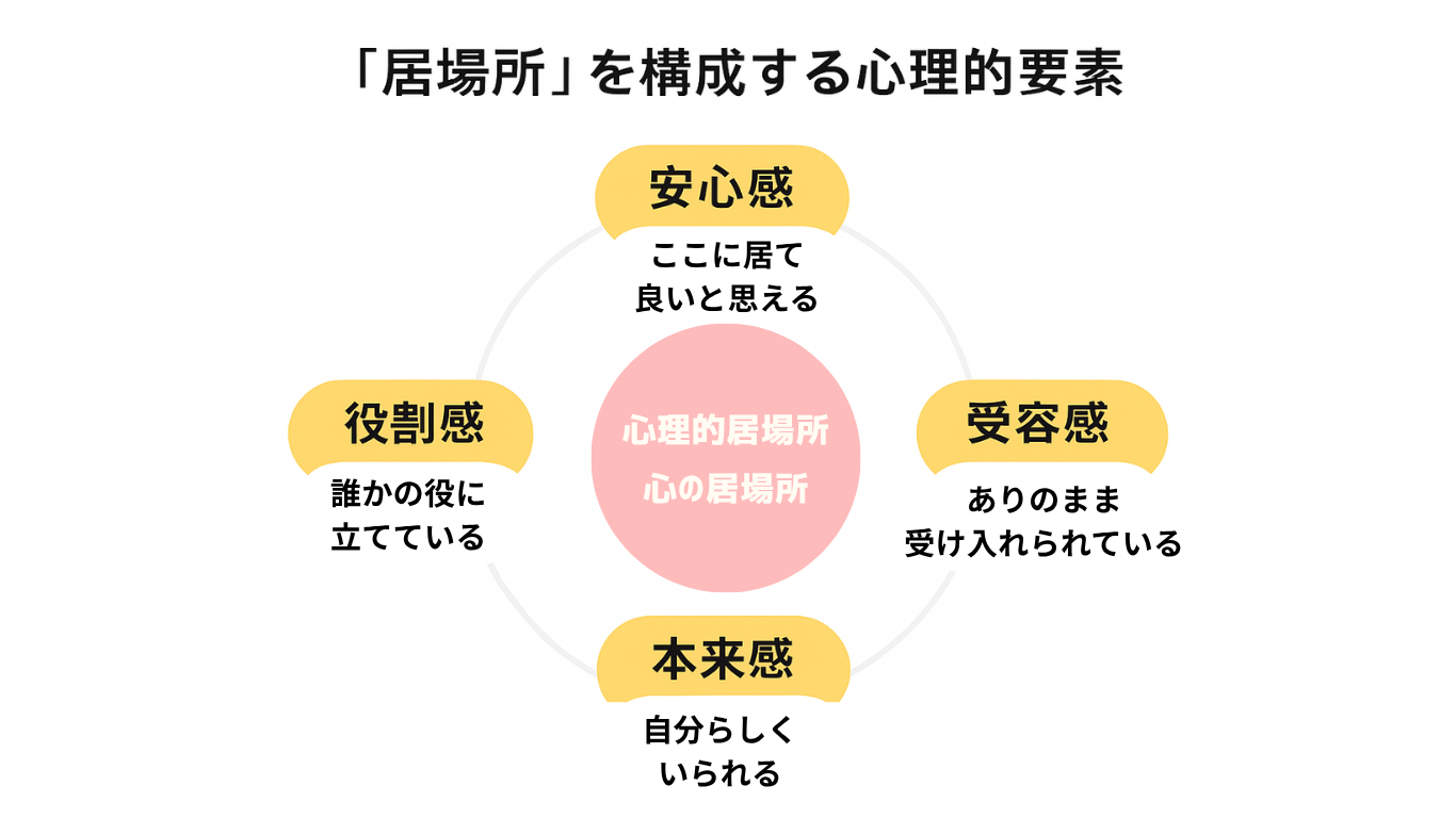 「居場所」は、それらの物理的・空間的に存在する場だけでなく、以下のような心理的な要素も重要であると考えられています。