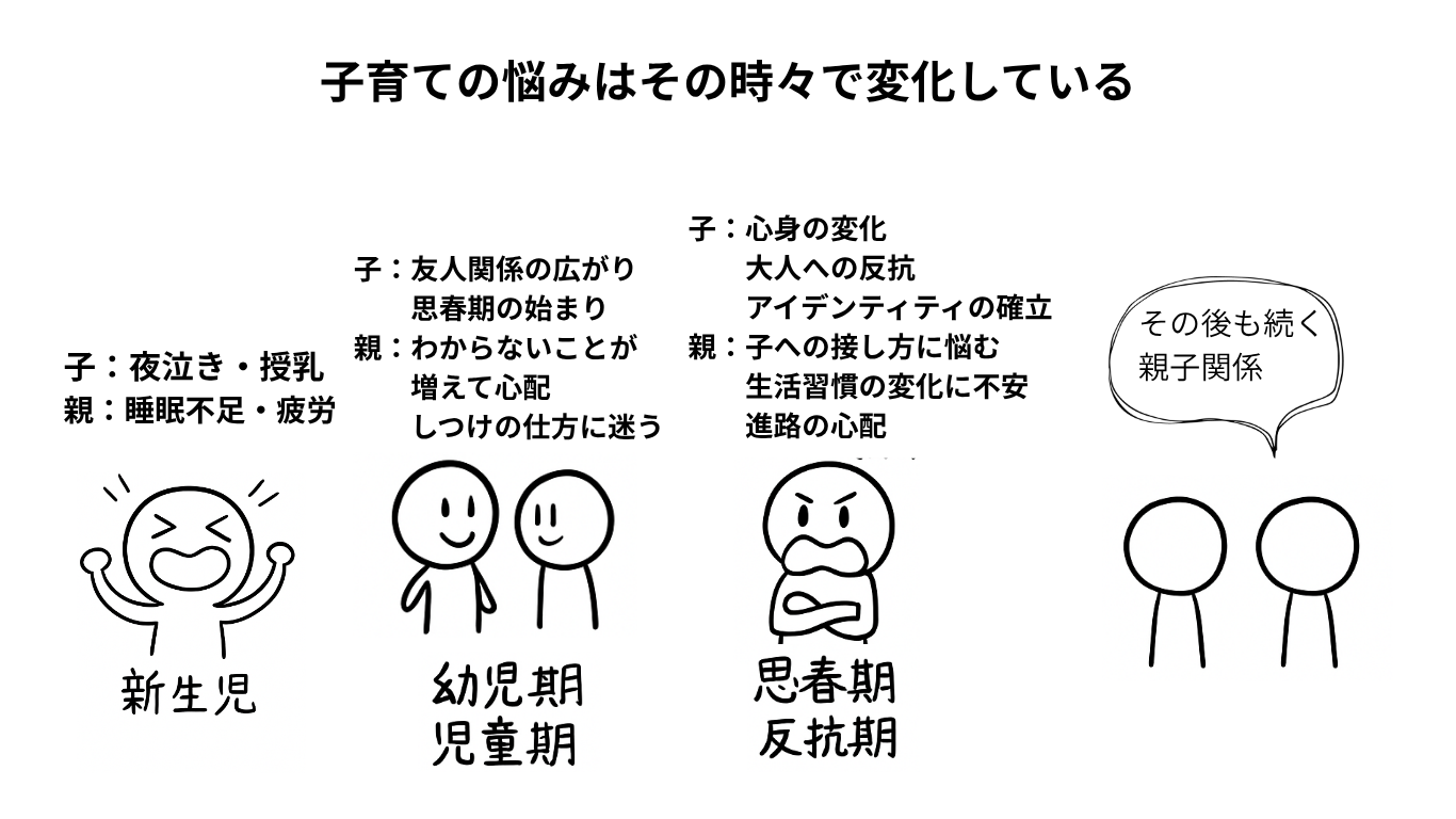まずは、子育てにまつわる心配や悩み、不安などについて、考えてみたいと思います。
