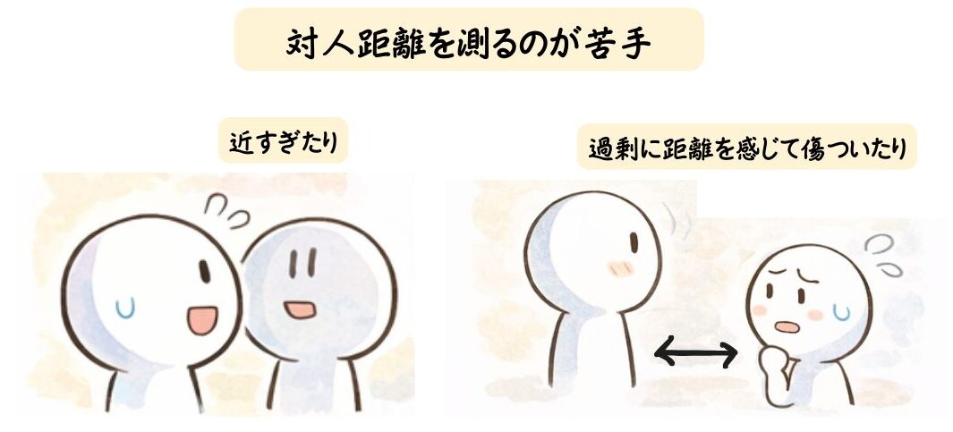 自分なりに少しづつ離れてみたり近づいてみたりしながら距離を測ることが難しいため、誰彼構わず急激に距離を縮めていって相手が驚いてしまったり、少し距離を調整しようとする相手の動きに「急に冷たくされた」と感じて傷ついてしまったりすることがあります。