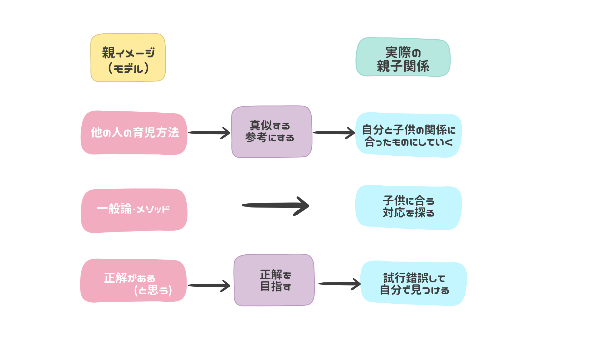 なぜなら、モデルとしている方の親子関係と、ご自身のお子さんとの親子関係は全く別物であり、モデル通りの声掛けや行動をしたとしても、同じ結果にはならないからです。