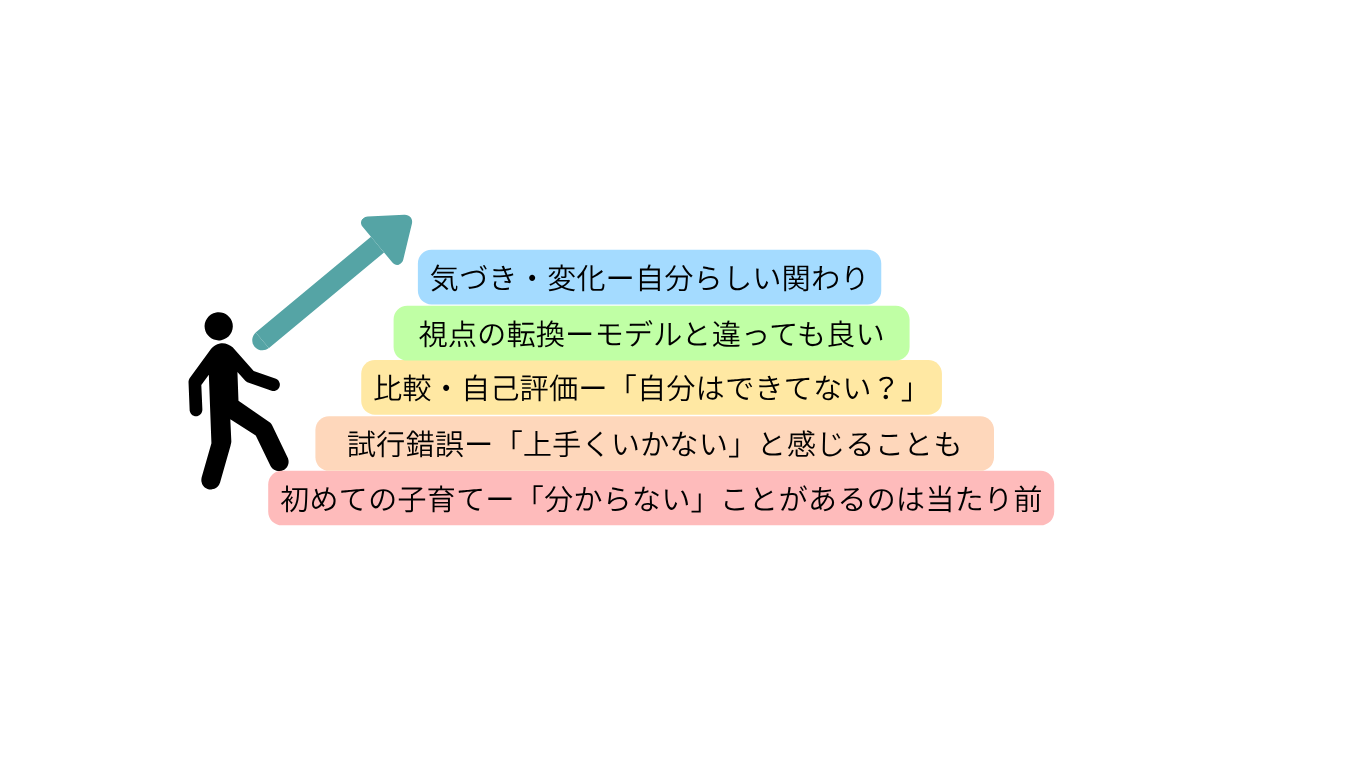 「モデルとなる人と違った」、「理想どおりにならない」と感じても、それを「ダメなこと」と評価をするのではなく、「違うスタイルの方が合っているのかもしれない」と視点を切り替え、お子さんの姿を見ながら、新たな自己像、親像や、親子関係を模索する過程も大切なものです。