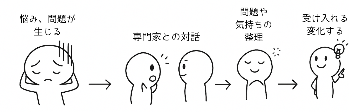 カウンセリングは、クライエント(相談者)が「困っていることや悩んでいることを専門家との会話や対話を通して解決または自己受容あるいは自己変容していくもの」とされます(厚生労働省 健康日本21アクション支援システム 用語辞典)。