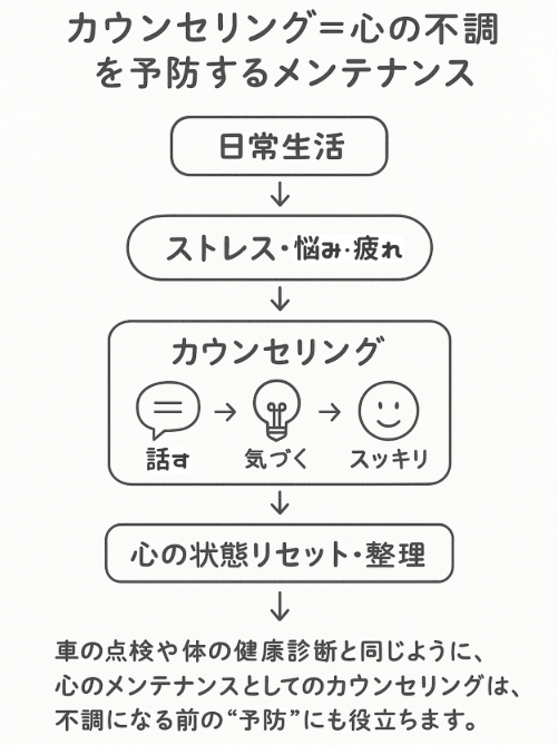 ところで、カウンセリングは不調の予防に役立つメンテナンスでもある、というと、イメージしにくいのではないでしょうか。