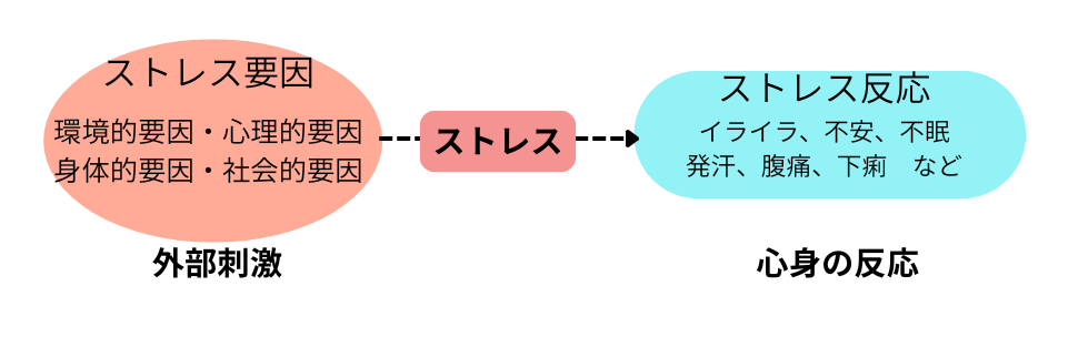 このように、今回の例では、仕事から受ける刺激により緊張が生じている状態「ストレス」といいます。